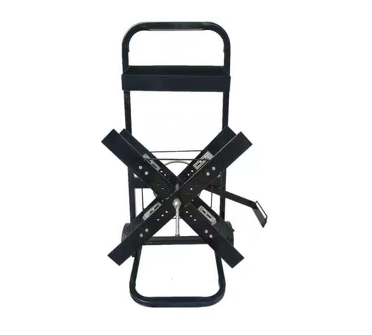 A metal strapping holder / trolley with wheels