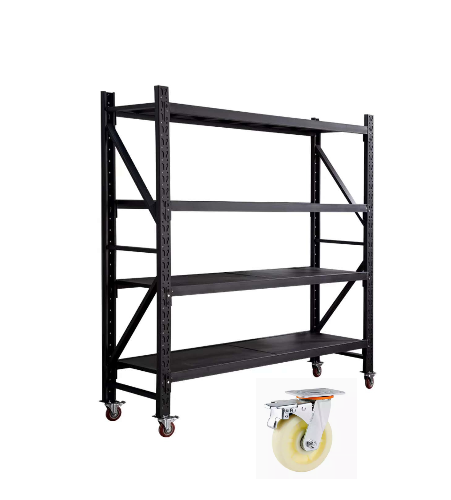 Heavy duty shelving unit 2m L x 600mmD x 2m H, 4 shelves, 200kg per shelf with wheels