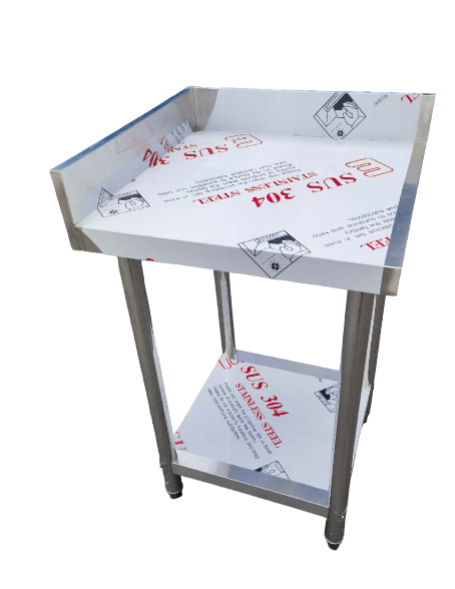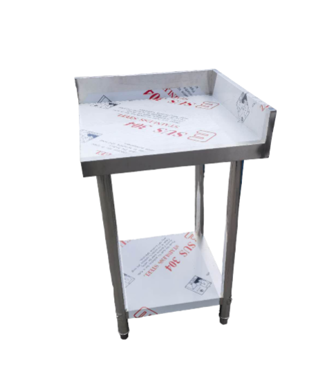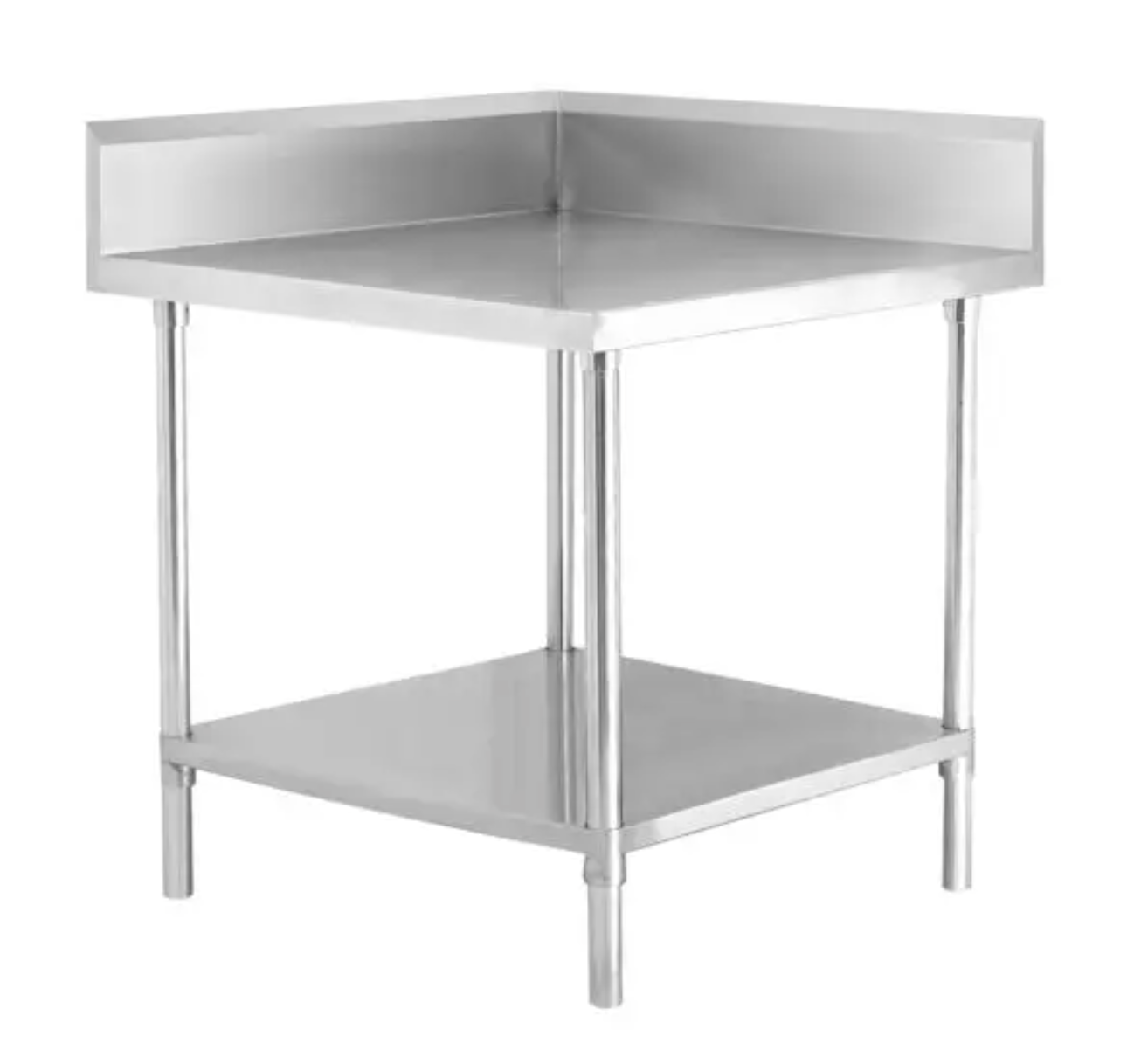 The bench is designed to fit seamlessly into a corner, maximizing workspace efficiency while providing ample room for food preparation or other tasks. Adjustable feet for stability on uneven floors and includes undershelves for additional storage. 304 Stainless steel for the top 1mm thick sheet....