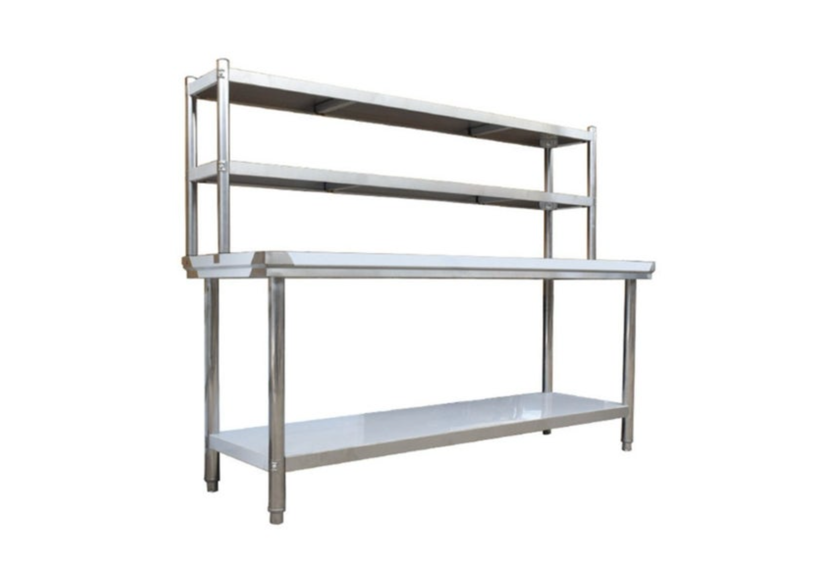 Above the main workbench, the overbench offers two additional shelves, ideal for storing equipment, utensils, or other frequently used items. The stainless steel construction ensures the workbench is resistant to rust, easy to clean, and highly durable, making it a perfect fit for commercial kitchens, workshops, laboratories, or food production facilities.